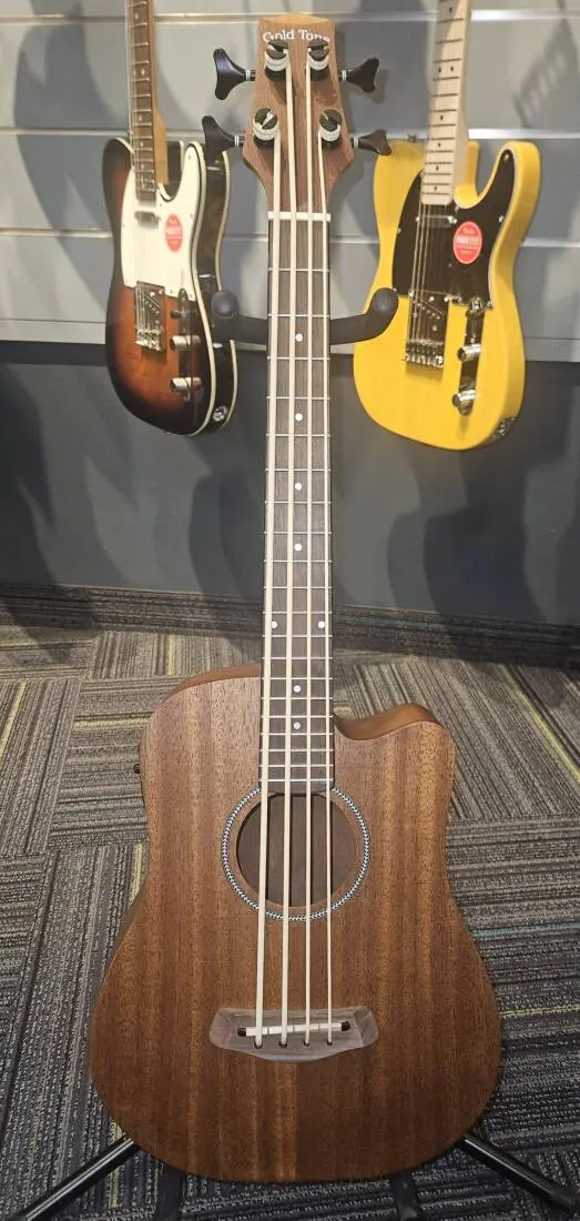 The MicroBass, or M-Bass, is a 23" short-scaled acoustic/electric bass guitar that utilizes a dedicated synthetic string made by the Aquila company and a piezo transducer pickup that deceivingly packs far more of a wallop than what meets the eye. The extended scale length greatly improves intonation over similar models and allows for an acoustic volume loud enough to enjoy without plugging into an amplifier. The sloped ergo-glide top makes this instrument extremely comfortable to hold.