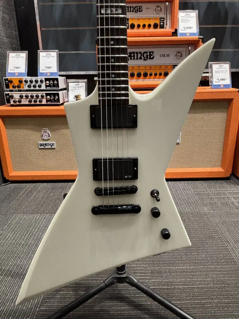 Formerly called “ESP Standard”, all ESP E-II instruments are created at our ESP factory in Tokyo, Japan, and are designed for professional players who accept no compromises in tone, feel, or reliability for their guitars and basses. The E-II EX NT is a killer guitar with a bold and angular design for musicians who like to make a statement from the moment they pull their guitar from the case. Available in Black and Snow White finishes, it features set-thru construction of a mahogany body and mahogany neck with ebony fingerboard, 22 extra-jumbo stainless steel frets, and a satin finish on the back for super smooth playability. The E-II EX NT includes premier-quality components like a bone nut, Gotoh locking tuners, a Gotoh TOM bridge and tailpiece, and ESP strap locks, along with a set of EMG 60 and EMG 81 pickups in Brushed Black Chrome. Includes an ESP hardshell form-fitting case.