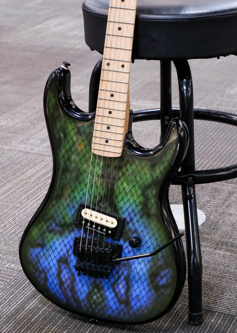 Retro fashion trends wouldn't be complete without some snakeskin, and this Baretta, with "Viper" graphics designed by Kramer Custom Graphic Artist Chris Stemmer, really delivers! Shredders chose to rock snakeskin boots, belts, and, of course, snakeskin Kramers! The Baretta is a tribute to one of the most iconic and original guitar designs in rock. Features an alder body, satin-finished hard maple neck, a single Seymour Duncan® JB™ zebra-coil humbucker™, and a Floyd Rose® 1000 series tremolo with an R2 1000 series locking nut. It is finished in an eye-catching Snakeskin Green Blue Fade.