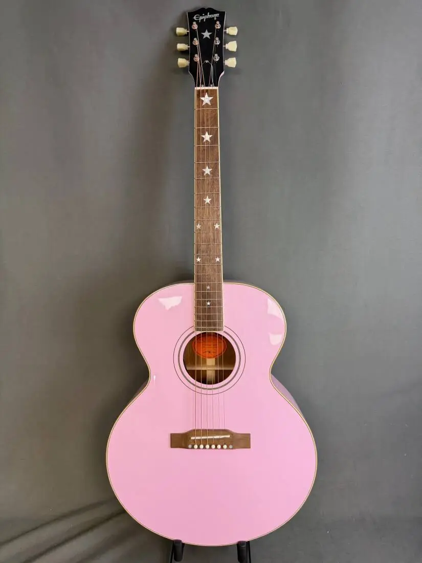 Premium features include a thermally aged solid spruce top with scalloped X bracing, solid mahogany back and rims, a one-piece mahogany neck is topped by a laurel pickguard inlaid with graduated mother-of-pearl Stars. The compensated saddle, bridge pins and nut are bone while the world renowned "open book" headstock bears the Epiphone logo and J-180 Star motif inlaid in mother of pearl. An Inspired by Gibson Custom Double Diamond emblem is etched into the back of the headstock and an LR Baggs VTC under-saddle pickup and preamp system ensures you're ready for studio or live stage. A hardshell case is also included.