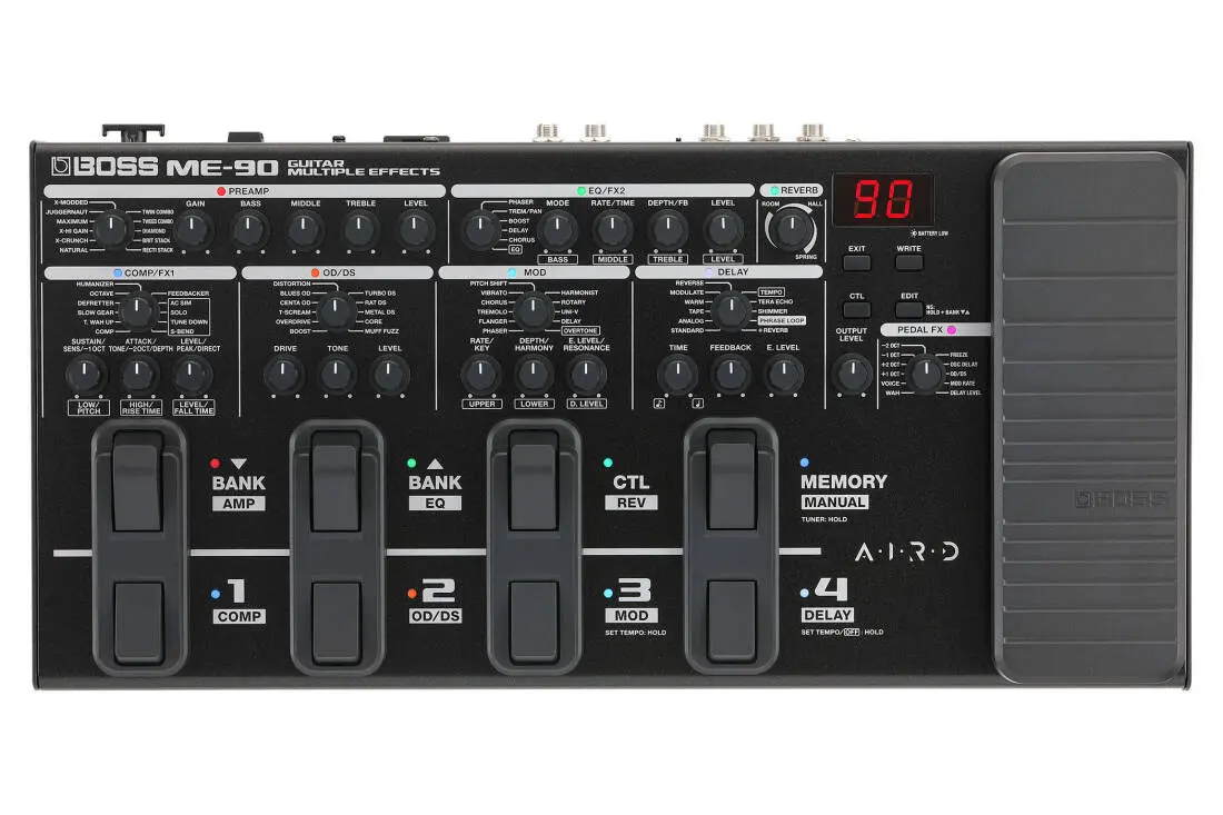 The ME-90 features eight footswitches with smooth, quiet operation and an expression pedal with an integrated toe switch. Use Memory mode to call up complete patch setups with the footswitches, and then switch to Manual mode for direct on/off control of each effect category within the patch. The footswitch LEDs light in different colours for quick identification in the heat of a performance. It's also possible to set all LEDs to light in a fixed colour for each mode if desired.