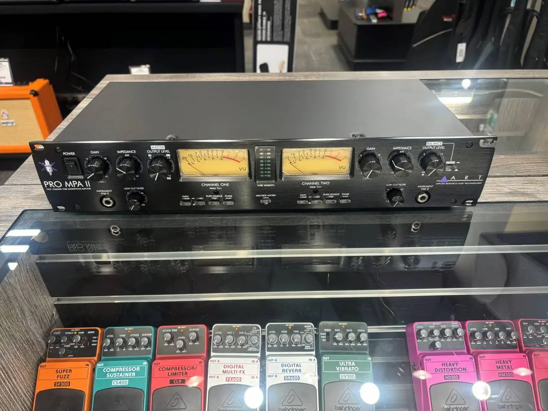 The ProMPA II can operate at either a low or high plate voltage on the two integrated hand-selected 12AX7 tubes for wider variation of preamp tone and performance. Large back-lit analog VU output meters display output levels while multi-colored LED arrays show tube gain.
