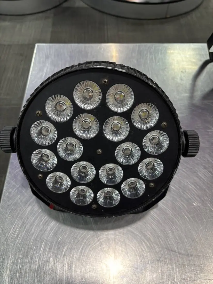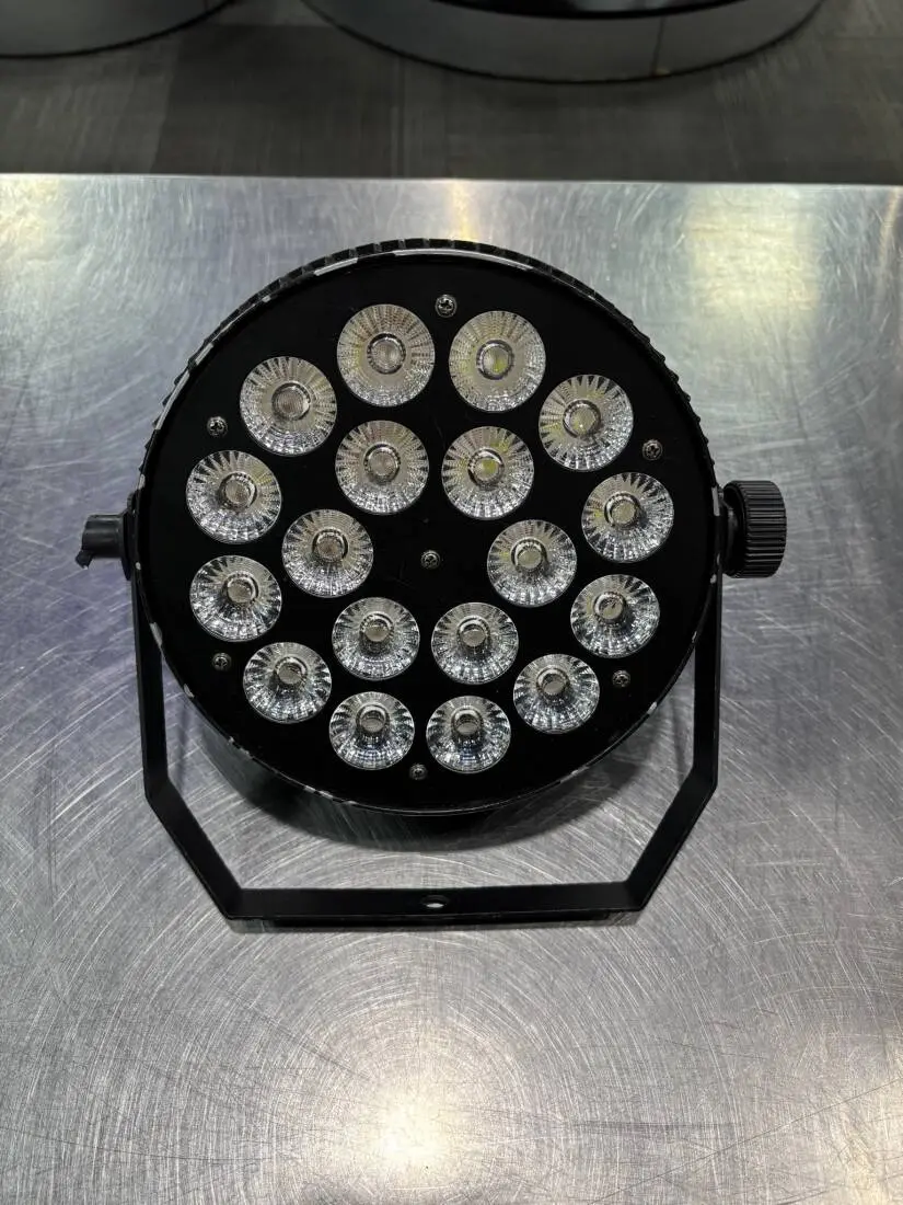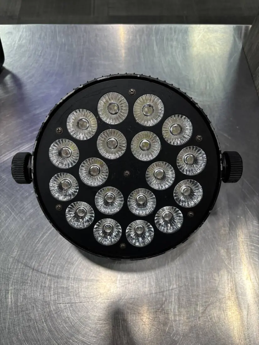 The ORCAN4 LED Flat Par Can uses 18 x 10W RGBWA + UV 6 in 1 LEDs. The LEDs are used for their long life, low power consumption, high brightness and excellent colour.