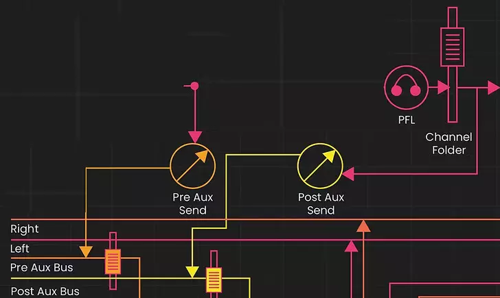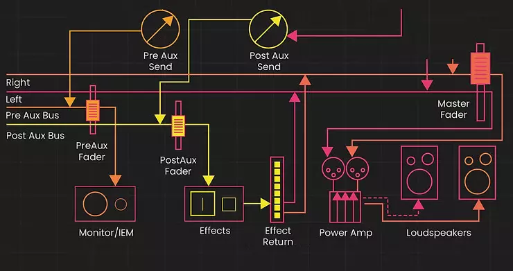 - Post-fader sends follow the fader level—perfect for effects so that reverb levels adjust with the main signal.