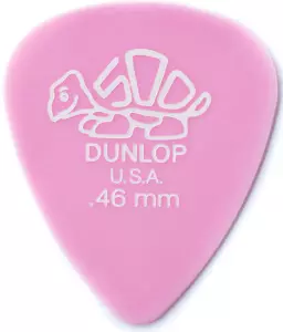 Delrin picks have a very even response, sounding neither too harsh nor too mellow. Due to perspiration and hand size, Delrin picks are often treated or coated to reduce slipperiness and improve grip during sweaty performances.